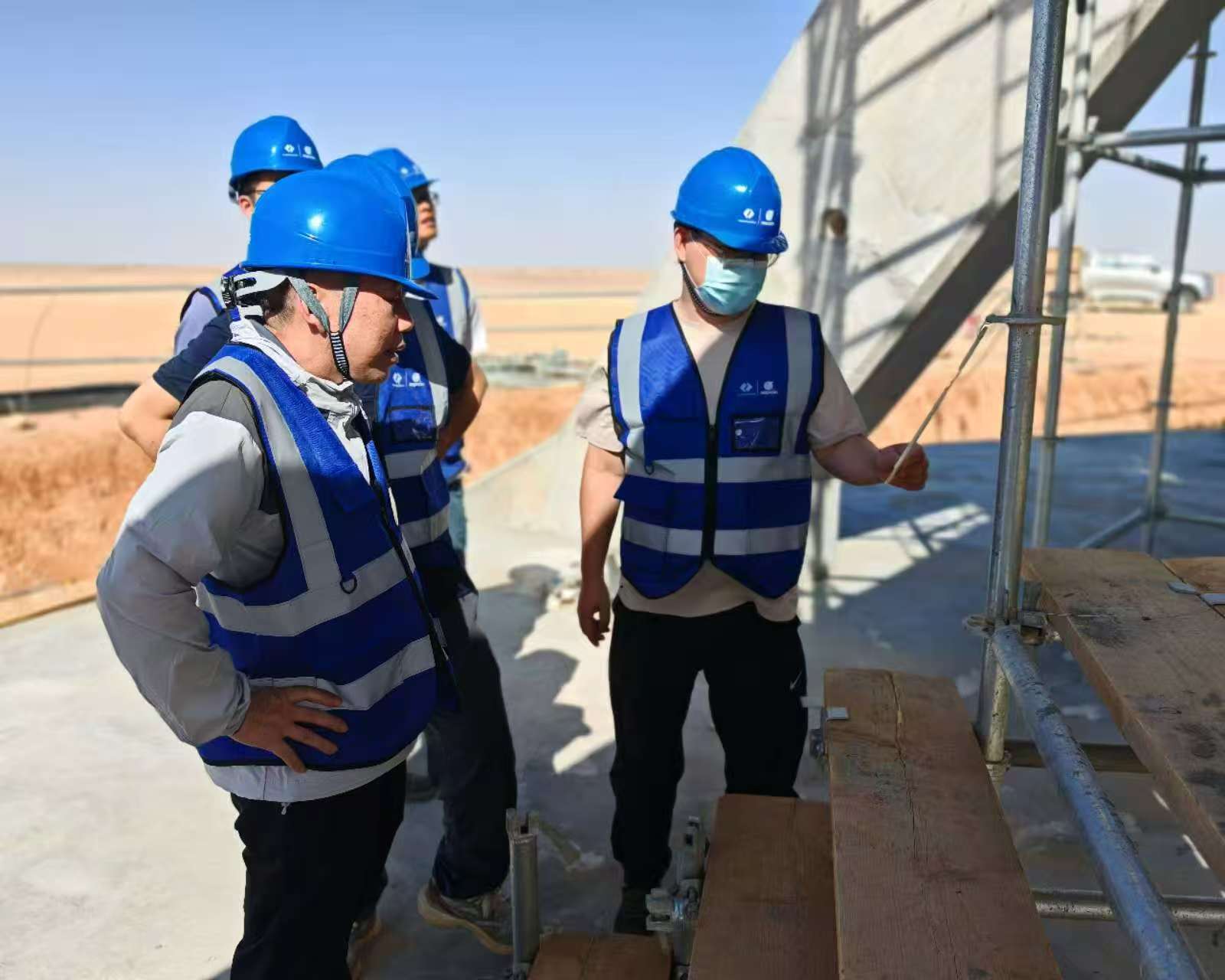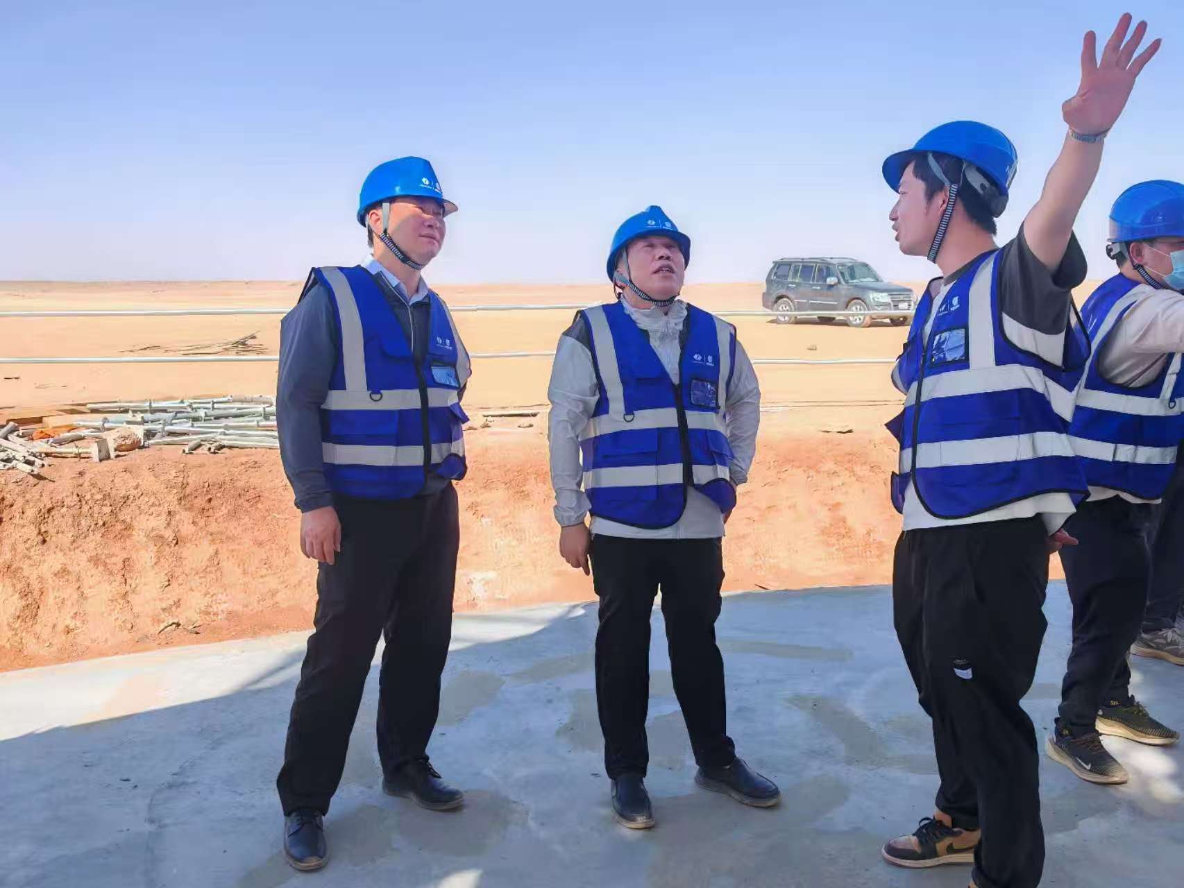 7月19日,,,,,省物化所所向导刘桂元、兴发xf936公司董事长宁欣一行到沙特项目一线,,,,,调理图莱夫项目生产进度、检查项目质量和清静生产等情形,,,,,并开展“送清凉”慰问,,,,,向坚守在外洋一线的员工致以真挚问候,,,,,为项目团队送去防暑药品与殷切眷注。。。。。。副总司理王湘源加入。。。。。。